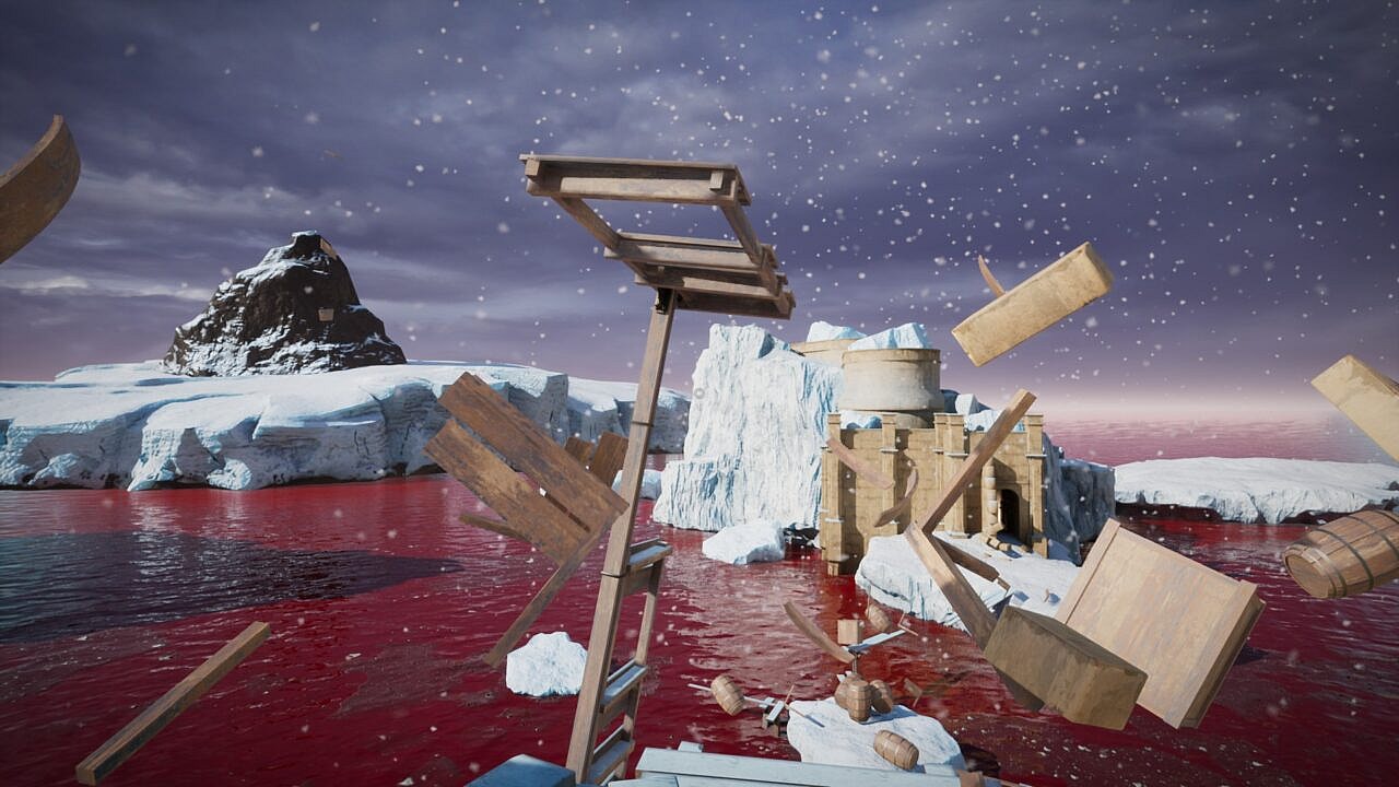 Enemies are not a huge concern in Horror Tales: The Wine. The person out there hunting is seen but rarely interacted with. Later in the game, you may have a run-in with them, but once again, I’m not going to spoil it. Another enemy is the level design itself. In an excellent turn, the world…moves. You’ll start to notice that some of the geometry doesn’t make sense. You’ll go around a pillar and come out in a completely different place. At one point, I went down a flight of stairs and found nothing. I tried to return the way I came, only to enter an entirely different world. This world was a far cry from the sunny streets I was used to. There were icebergs floating in a sea of blood-red wine.