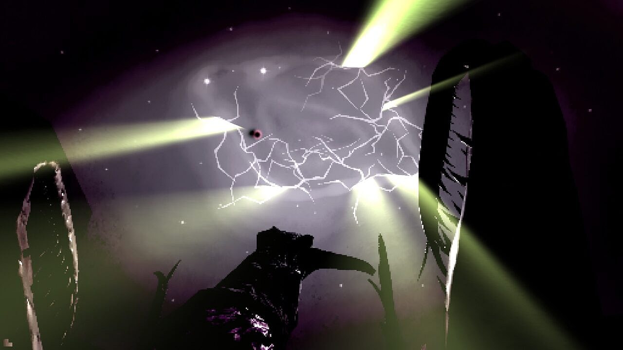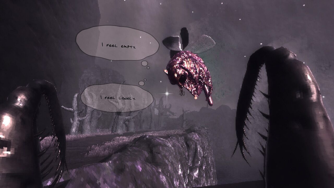 From here the experience is straightforward. Seek out the souls with falling dreams as you travel between corporeal nightmares, and surely try not to tear off any more body parts. As you once again find yourself back on the still shores, you settle into your newfound fleshy path of helping and hindering. While the map is simple and does require some back-and-forth scurrying, the biting narrative of even clone-like squirrels hits you with familiarization and empathy. Lugubrious beast-friends await your “encouragement”. Moths purr above a small thicket of undulating trees, and on the craggy cliff edge hovers a body of glum decay with a bushy tail. It seems they possess the dream plaguing and gnawing at all residents of this melancholy hamlet; Flight.