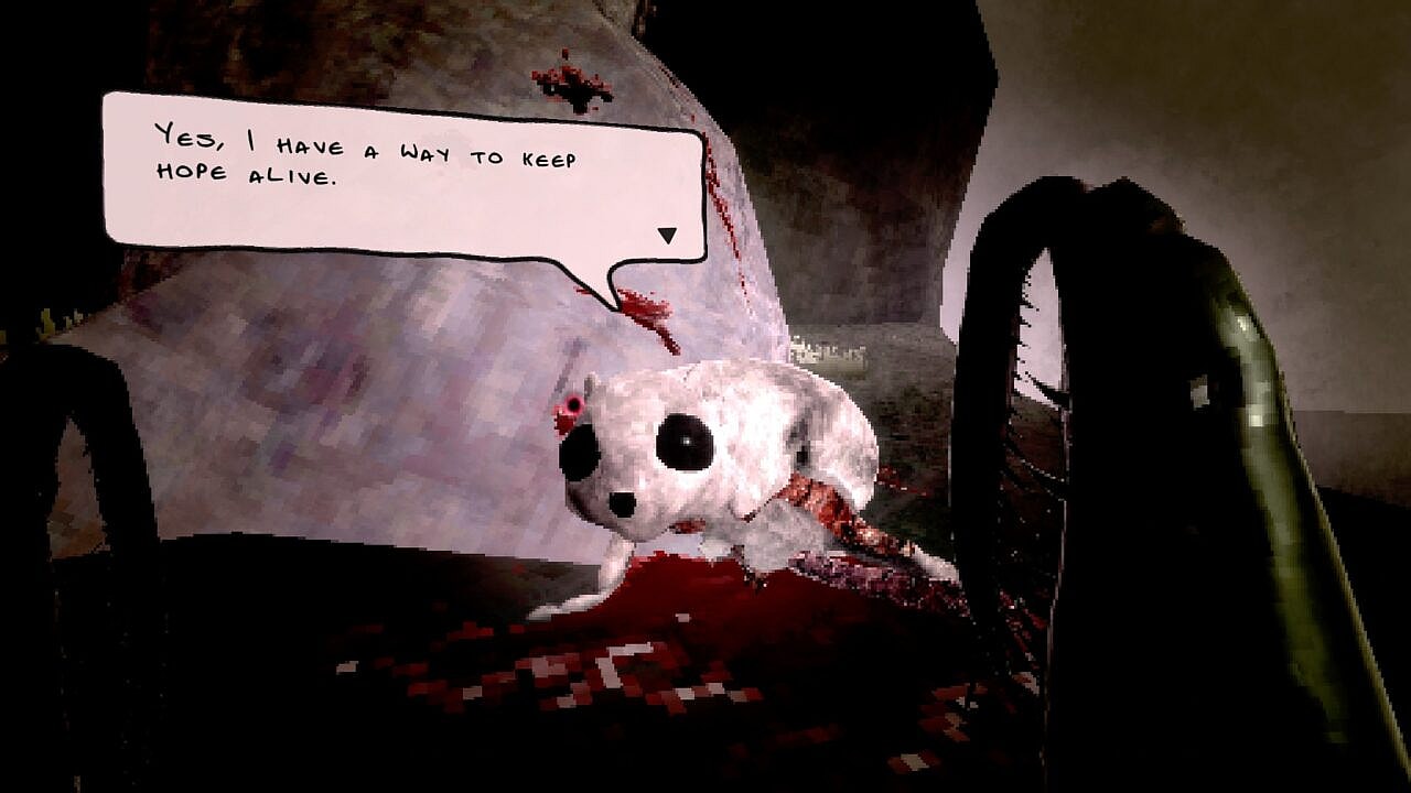 You immediately begin picking up on the symbolism and meaning behind your first interaction. The sore sacrifices you feel you must make when your dreams begin to fade. The moroseness that eats you from the inside out as you realize you’ve given your blood, sweat, and mental energy to a seemingly lost cause. But hope is not lost. Perhaps in another form, you still may fly. In this alternate haze of cosmic despair, you find your friend in tears, crying out at the dark sky. It’s an offering. They wish to sacrifice more for your relationship. All so you can repair the bridge once again. With a desperate attempt to achieve their goal of soaring amongst the clouds, the squirrel finds itself in a violent situation, as it earnestly begs for help. You must make your first decision. Cut them down in an attempt to rescue, or selfishly tear the flesh to repair anew.