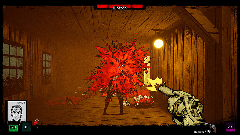 It is a look that a lot of people are comparing to Fallen Aces; The unreleased comic-book-style shooter being published by New Blood. The comparisons are so prevalent that in the first level of Forgive Me, Father you’ll come across a table with some playing cards on it, and when you inspect them, you get a dialogue box saying something along the lines of, “hmm fallen aces”. They know you’re thinking it. Even though the enemies are 2D, their look will change based on the damage they take. Big, burly men in fedoras bursting at the seams can be blown in half, leaving their upper half to crawl after you and become a nuisance. A group of enemies that shoot acid can have their acid tanks shot, turning them from a long-distance threat into a shambling, melty, melee threat. The changes between enemy types that can be caused by damage keeps gameplay in Forgive Me, Father fresh. Some enemies are much easier to deal with non-altered. You need to watch your shot to avoid triggering some of these transformations.