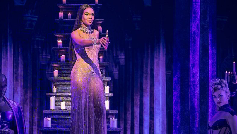 Williams’ Viola (succeeding Isabella Rossellini’s role in the film) proves to be a gravitational pull. This musical drenches Derek McLane’s vibrant scenic design in the purple hues of Viola’s Gothic manor. Like an omniscient trickster goddess, a smirking Viola haunts the musical when she’s not regaling herself in her Gothic palace of Immortal partiers (an ensemble led by Viola’s second-in-command Chagall, played by an alluring Taurean Everett).