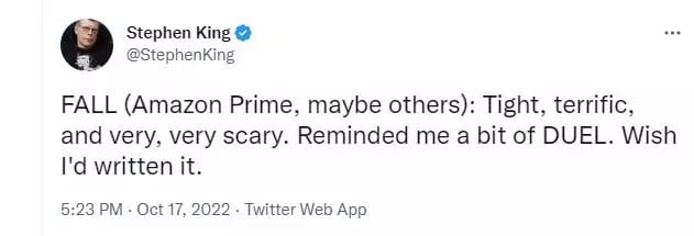 Fall is so utterly terrifying that even genre master Stephen King wishes he had written it, as he posted the following Tweet four years ago. He called it “tight, terrific, and very, very scary.”