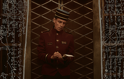 New 'Hokum' poster, featuring a solitary hotel bellhop framed in an elevator, surrounded by cryptic chalk-like equations.